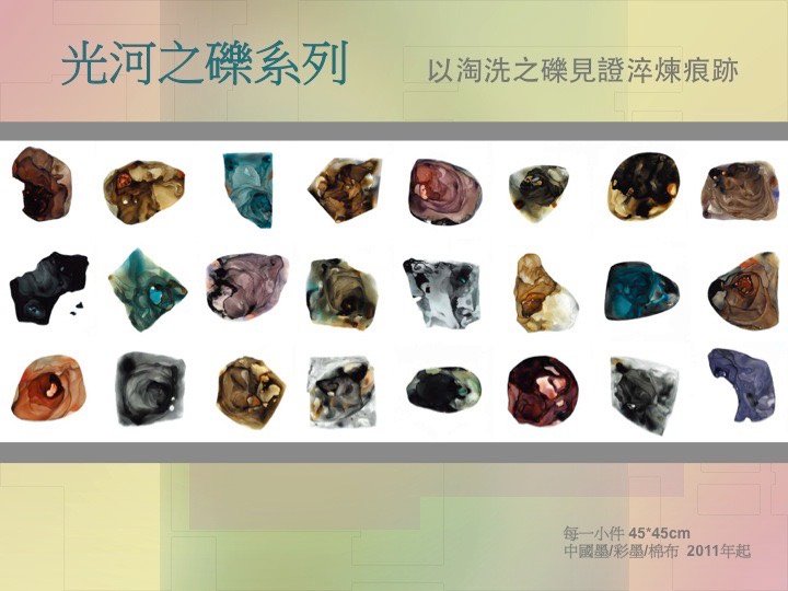 大字的《水漾》、《逐光採石》、《光河之礫》等是我的水墨系列名稱,用三種書體呈現。