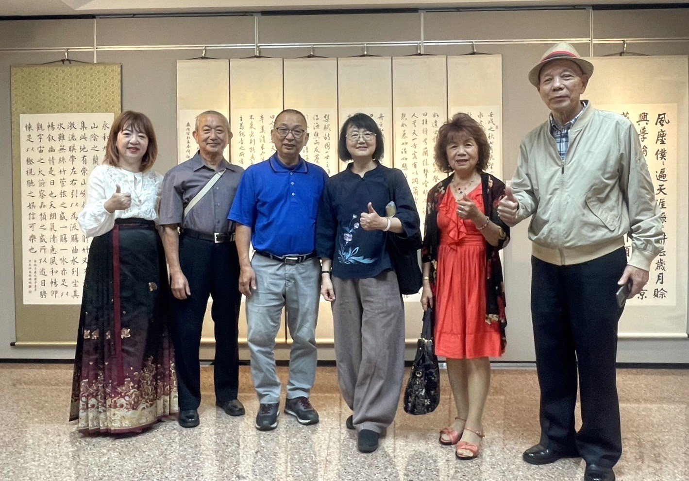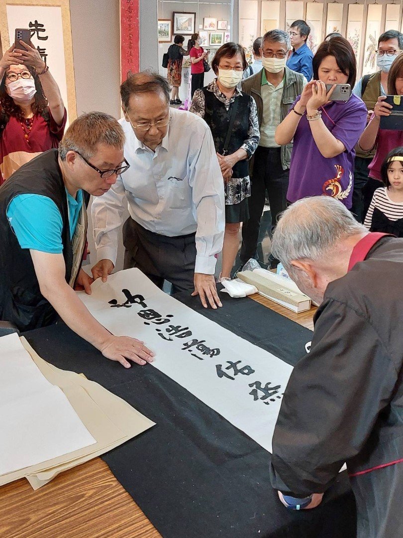 昨日先嗇宮墨堂藝遊展開幕,三重區公所陳坤宏主秘、先嗇宮李乾龍董事長、兩岸文創協會王正典理事長、澹廬書會李建德理事長、雲龍書會張玉盆會長、傑閣書會徐靜國會長暨代表、餘三書會李朝仁暨代表、新莊書畫會徐秀娥前會長、亼藝設計公司李振剛先生、郭金堂老師、禪太極周龍修先生、林欽商老師、馬豫平老師、國畫家李德珍女史…等多個單位領導、各界先進及藝文同好蒞臨。此外,先進黃志煌顧問、謝慶興顧問、青雲殿黃佳玲主委、傑閣徐會長、一德蔡玉雲會長、澹廬廖錫淵老師、玉盆會長等贈賀詞祝福,身為書法班指導老師,欣慰學員們的學習成果,能受長輩及外界肯定!