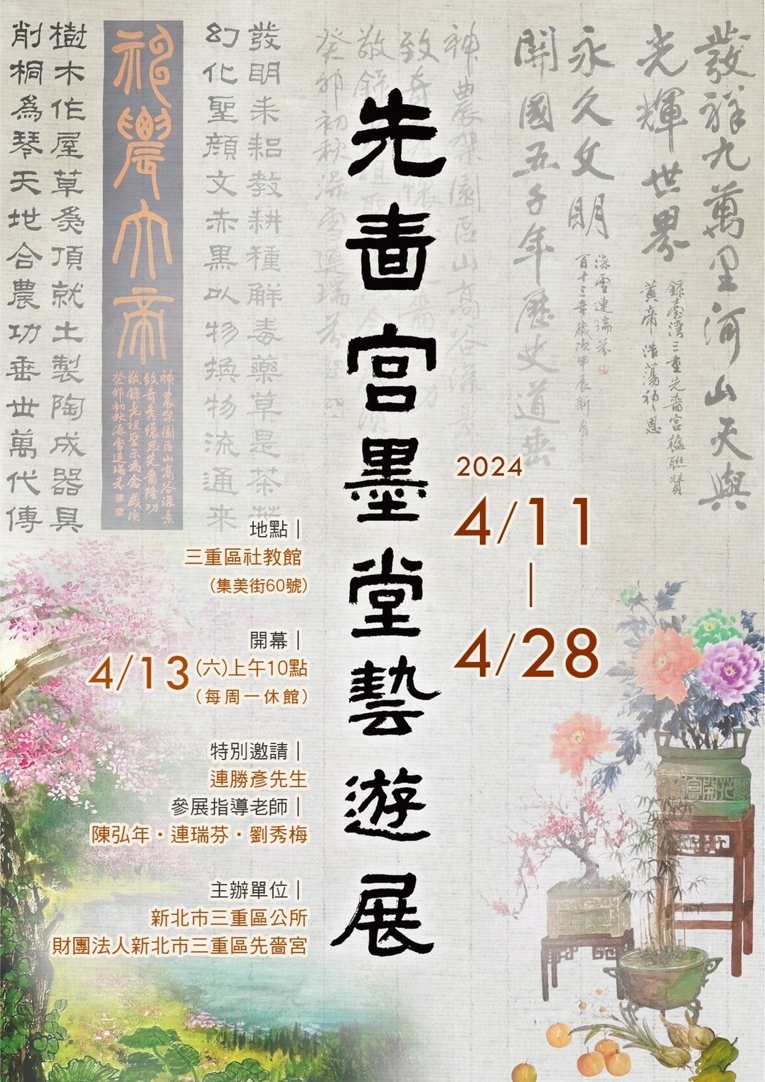 一年一度墨堂成果展即將在四月份展開,適逢三級古蹟先嗇宮建廟270週年,神農大帝庇佑地方繁榮,香火鼎盛,寺廟建築因兩組師傅鬥場較技所產生的特色亦為人所稱道。