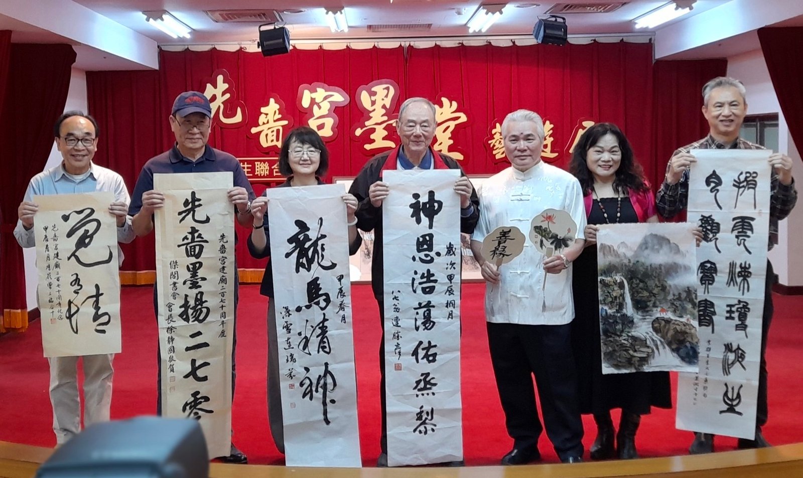 昨日先嗇宮墨堂藝遊展開幕,三重區公所陳坤宏主秘、先嗇宮李乾龍董事長、兩岸文創協會王正典理事長、澹廬書會李建德理事長、雲龍書會張玉盆會長、傑閣書會徐靜國會長暨代表、餘三書會李朝仁暨代表、新莊書畫會徐秀娥前會長、亼藝設計公司李振剛先生、郭金堂老師、禪太極周龍修先生、林欽商老師、馬豫平老師、國畫家李德珍女史…等多個單位領導、各界先進及藝文同好蒞臨。此外,先進黃志煌顧問、謝慶興顧問、青雲殿黃佳玲主委、傑閣徐會長、一德蔡玉雲會長、澹廬廖錫淵老師、玉盆會長等贈賀詞祝福,身為書法班指導老師,欣慰學員們的學習成果,能受長輩及外界肯定!